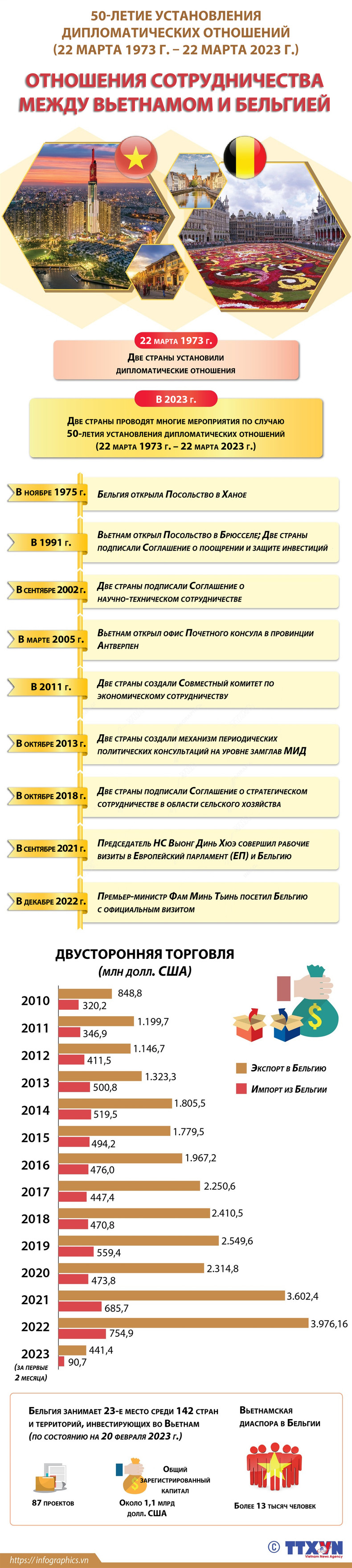 За последние полвека (22 марта 1973 г. – 22 марта 2023 г.) отношения между Вьетнамом и Бельгией принесли положительные результаты на всех уровнях и во всех областях, особенно сферах политики и дипломатии, торговли, сельского хозяйства...
