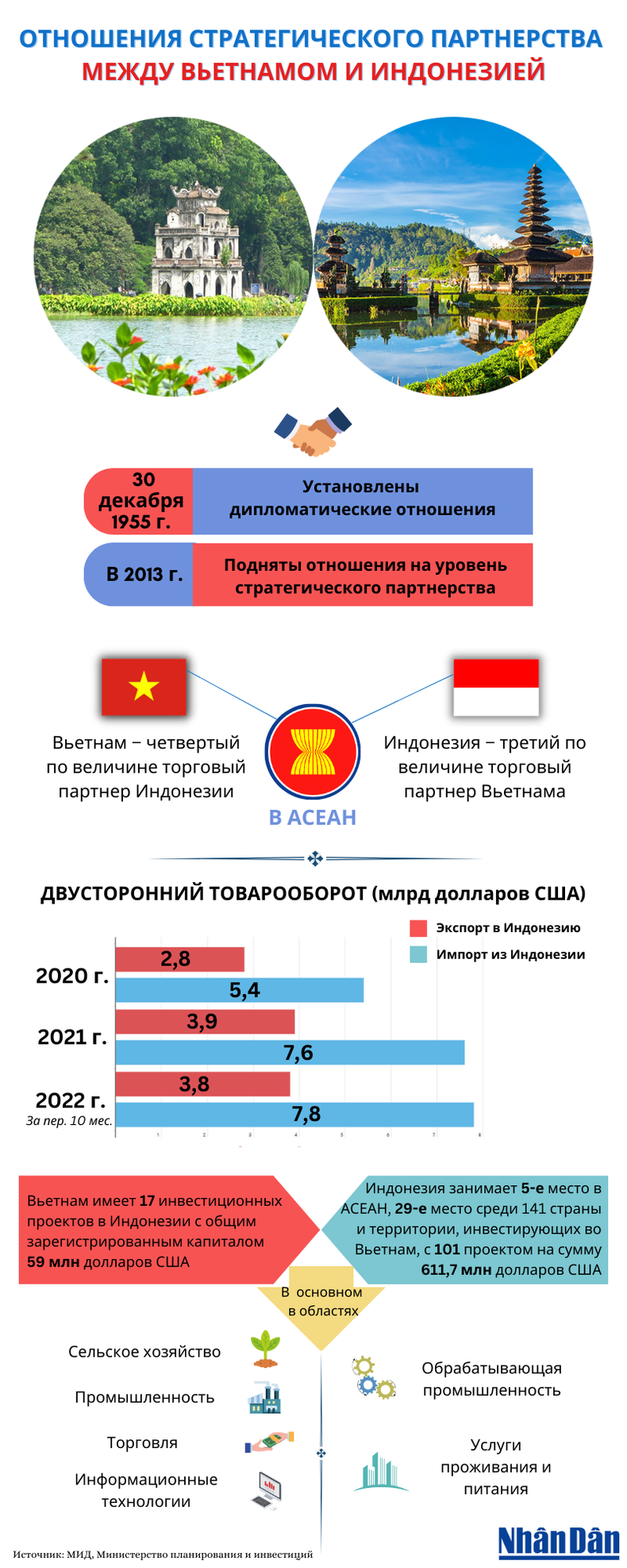 В последние годы, несмотря на воздействие пандемии Covid-19, отношения стратегического партнерства между Вьетнамом и Индонезией продолжают хорошо развиваться. Индонезия в настоящее время является третьим по величине торговым партнером Вьетнама в АСЕАН, а Вьетнам – четвертым по величине торговым партнером Индонезии в АСЕАН.