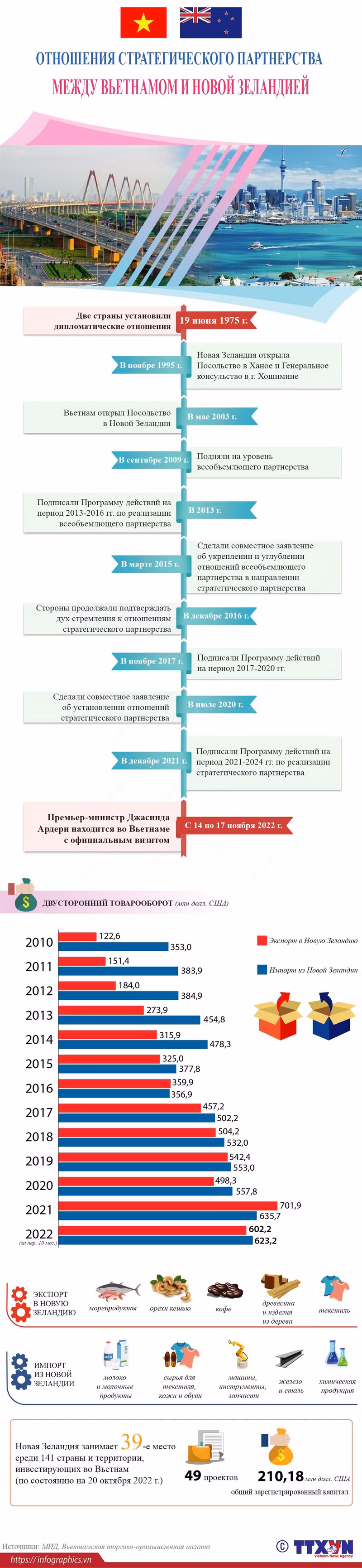 Вьетнам и Новая Зеландия установили дипломатические отношения 19 июня 1975 года и подняли двусторонние отношения до уровня всеобъемлющего партнерства в сентябре 2009 года. Отношения стратегического партнерства между Вьетнамом и Новой Зеландией были установлены в июле 2020 года, что придало новый импульс, содействовало углубленному и практическому развитию двустороннего сотрудничества.