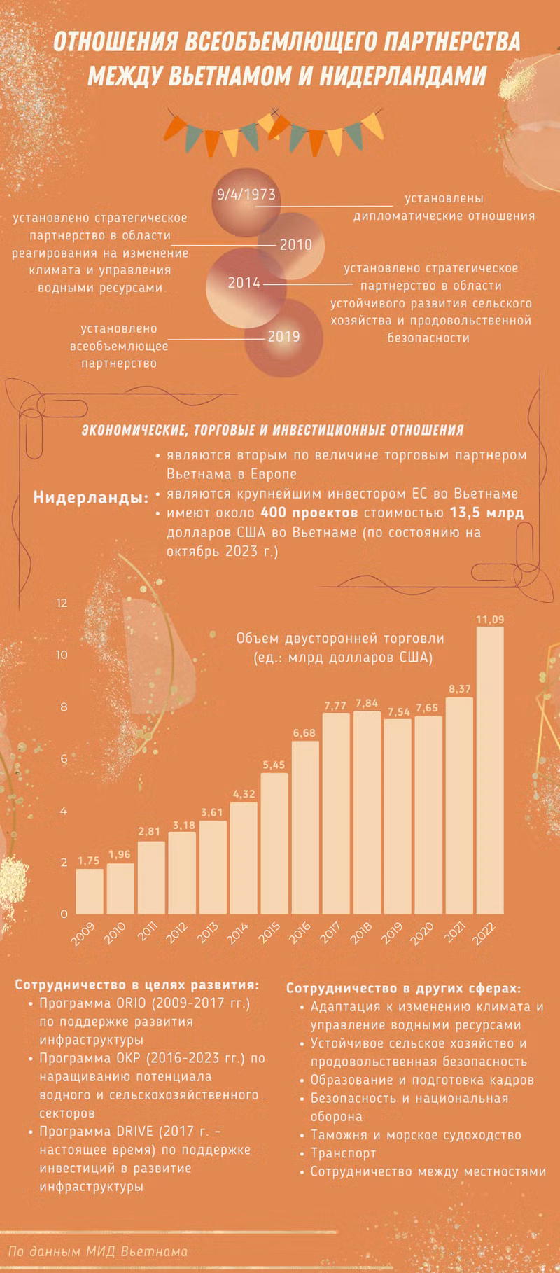 В последние годы отношения между Вьетнамом и Нидерландами активно развивались во многих областях, особенно в сферах инвестиций, торговли, сельского хозяйства и реагирования на изменение климата. Обе стороны поддерживают регулярный обмен делегациями на всех уровнях, имеют множество механизмов двустороннего сотрудничества, тесно координируют действия и поддерживают друг друга на международных форумах и в международных организациях.