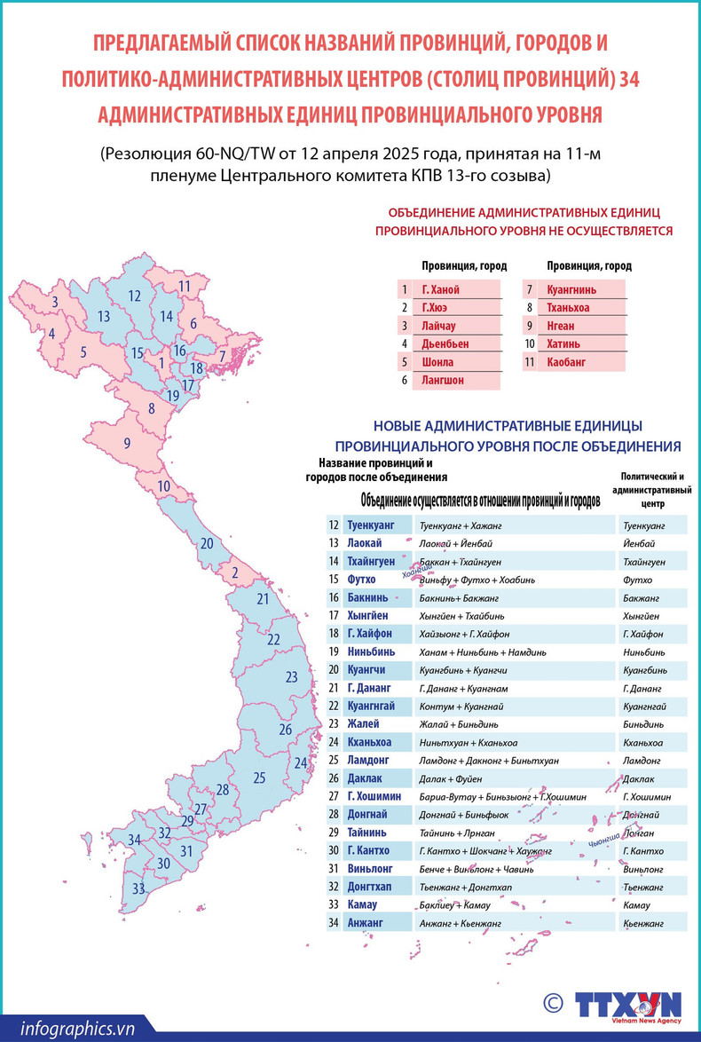 От имени Центрального комитета КПВ 12 апреля 2025 года Генеральный секретарь ЦК КПВ То Лам подписал Резолюцию № 60-NQ/TW 11-го пленума ЦК КПВ 13-го созыва. Центральный комитет согласился на политику реорганизации административных единиц провинциального уровня по всей стране в 34 единицы, включая 28 провинций и 6 городов центрального подчинения.
