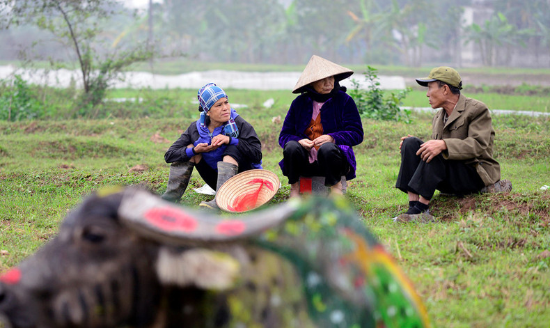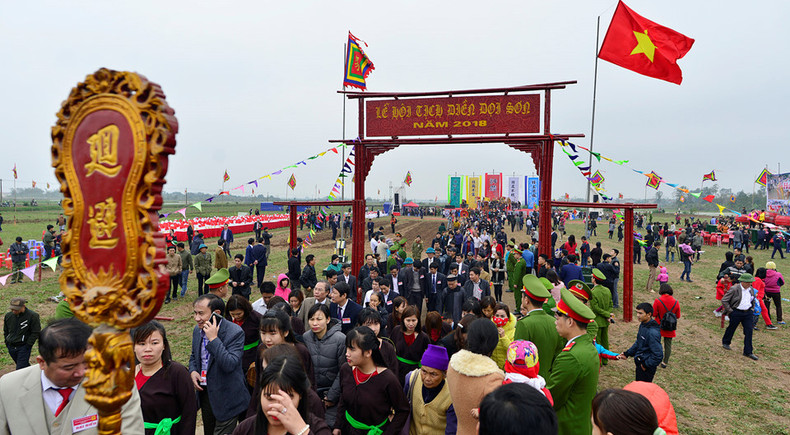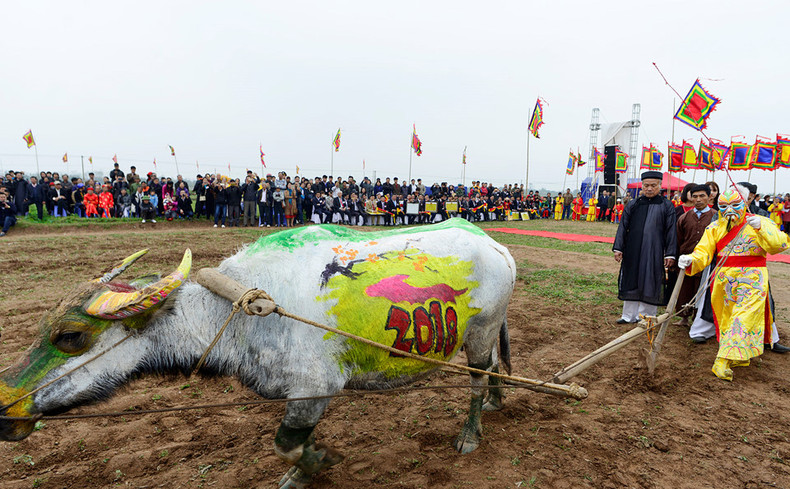 За день до праздника десятки сильных буйволов, окрашенных с изображениями весны и Тэт Желтой собаки 2018, соревновались друг с другом. Самый сильный и наиболее красиво окрашенный буйвол выбран для обработки земли с «королем Ле Дай Ханем».