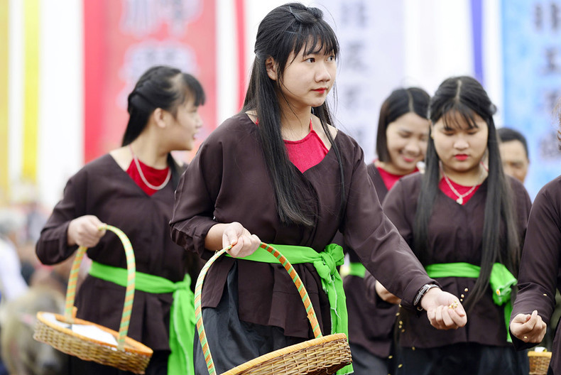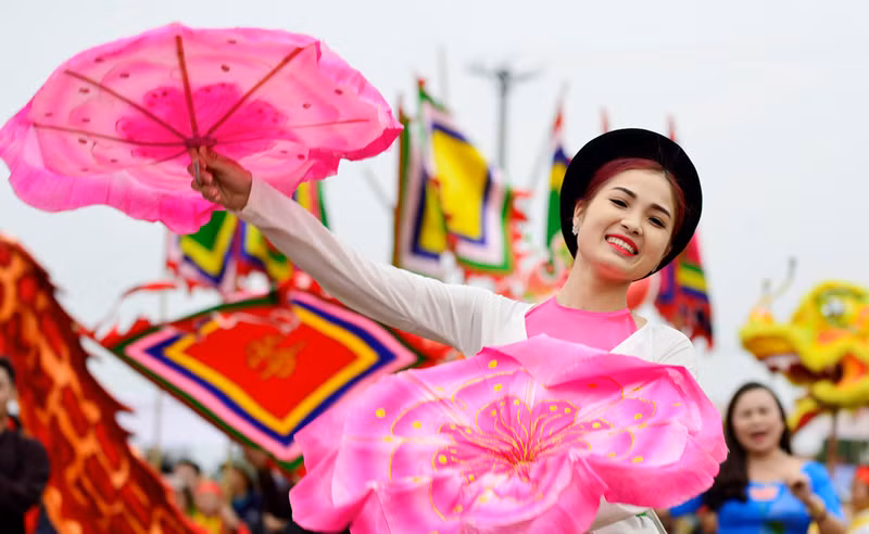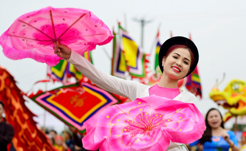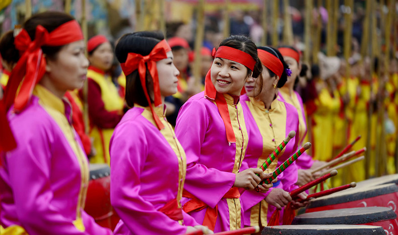Женщины Дойшона ударяют в барабан в знак открытия фестиваля. Эта деревня известна ремеслом изготовления барабанов. Почти все барабаны, используемые на важных мероприятиях во Вьетнаме, изготовлены в Дойшоне.