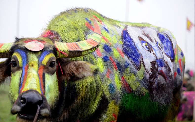 Буйволы ярко окрашены. Даже на их коже нарисовано изображение собаки – талисман 2018 года.