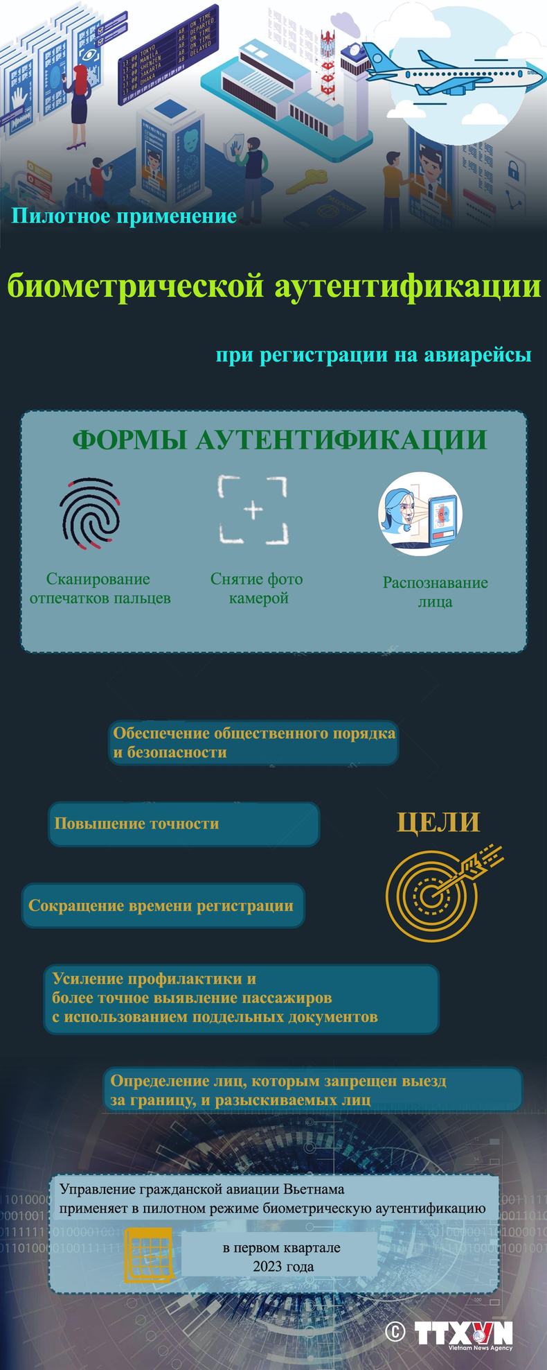 В первом квартале 2023 г. Управлением гражданской авиации Вьетнама в пилотном режиме применяется биометрическая аутентификация при регистрации граждан на авиарейсы. Предварительные результаты будут представлены на рассмотрение Министерства транспорта и путей сообщения для получения разрешения.