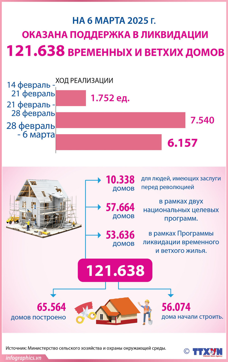 По состоянию на 6 марта во Вьетнаме было отремонтировано или заменено в общей сложности 121 638 временных и ветхих домов. Из них 65 564 домов были завершены, а строительство еще 56 074 домов было начато. В частности, 10 338 домов были построены или отремонтированы для тех, кто имел заслуги перед революцией.