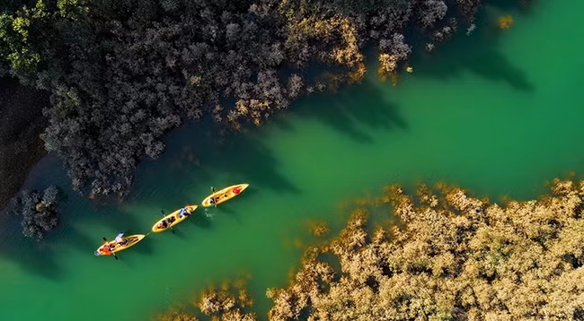 Туристы катаются на каяках по реке в пределах степной зоны. Фото: vnexpress.net