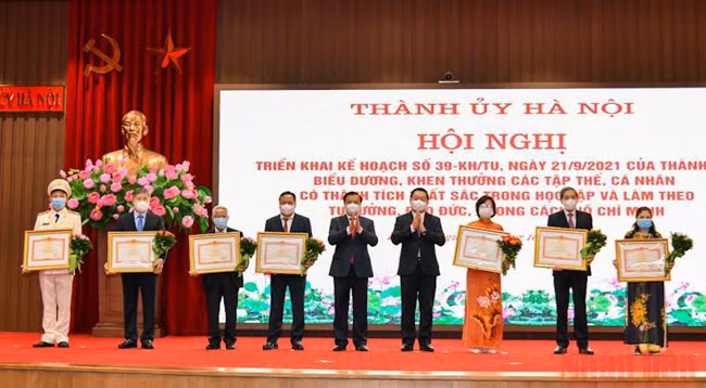 Товарищи Динь Тиен Зунг и Нгуен Чонг Нгиа вручают похвальные грамоты коллективам и лицам, которые достигли выдающихся результатов в изучении и усвоении идеологии, нравственности и стиля Хо Ши Мина. Фото: Зюи Линь
