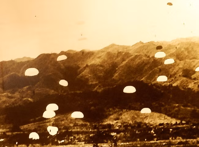 Французские солдаты прыгают с парашютом в укрепление опорной группировки войск в Дьенбьенфу в декабре 1953 года. Фото: kinhtedothi.vn