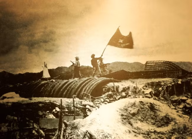 Победоносный флаг Хо Ши Мина развевается над ставкой французского бригадного генерала де-Кастри 7 мая 1954 года. Фото: kinhtedothi.vn