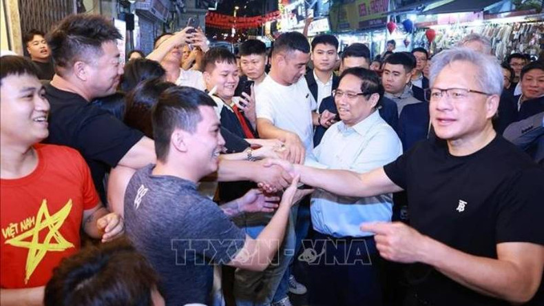 | Премьер-министр Фам Минь Тьинь и г-н Дженсен Хуанг посещают Старый квартал и встречаются с местными жителями. |