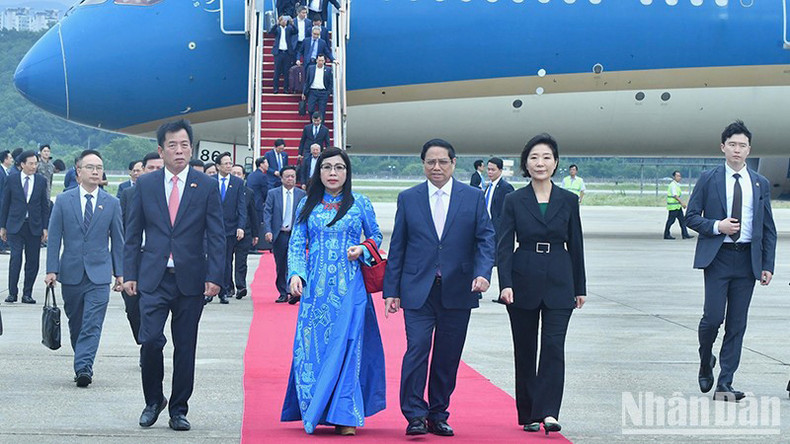 Премьер-министра Фам Минь Тьиня с супругой и вьетнамскую делегацию в аэропорту встречают, с южнокорейской стороны, Министр малого, среднего и венчурного бизнеса О Ён Чжу, Посол Южной Кореи во Вьетнаме Чхве Ён Сам, глава Департамента протокола (Министерство иностранных дел) Со Вон Сам, глава Департамента по вопросам АСЕАН (Министерство иностранных дел) Ким Донг Пэ, c вьетнамской стороны, Посол Вьетнама в Южной Корее Ву Хо, сотрудники Посольства и представители местной вьетнамской диаспоры.