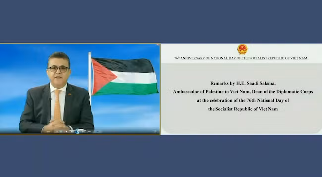 Выступая на церемонии, Посол Палестины во Вьетнаме, глава дипломатического корпуса Саади Салама поздравил Вьетнам с успешным проведением мероприятий, таких как XIII Съезд КПВ, выборы депутатов НС и Народных советов всех уровней. Он отметил, что успехи Вьетнама на пути развития, особенно его усилия по реагированию на пандемию Covid-19, служат основой для привлечения инвестиций и укрепления доверия других стран к нему.