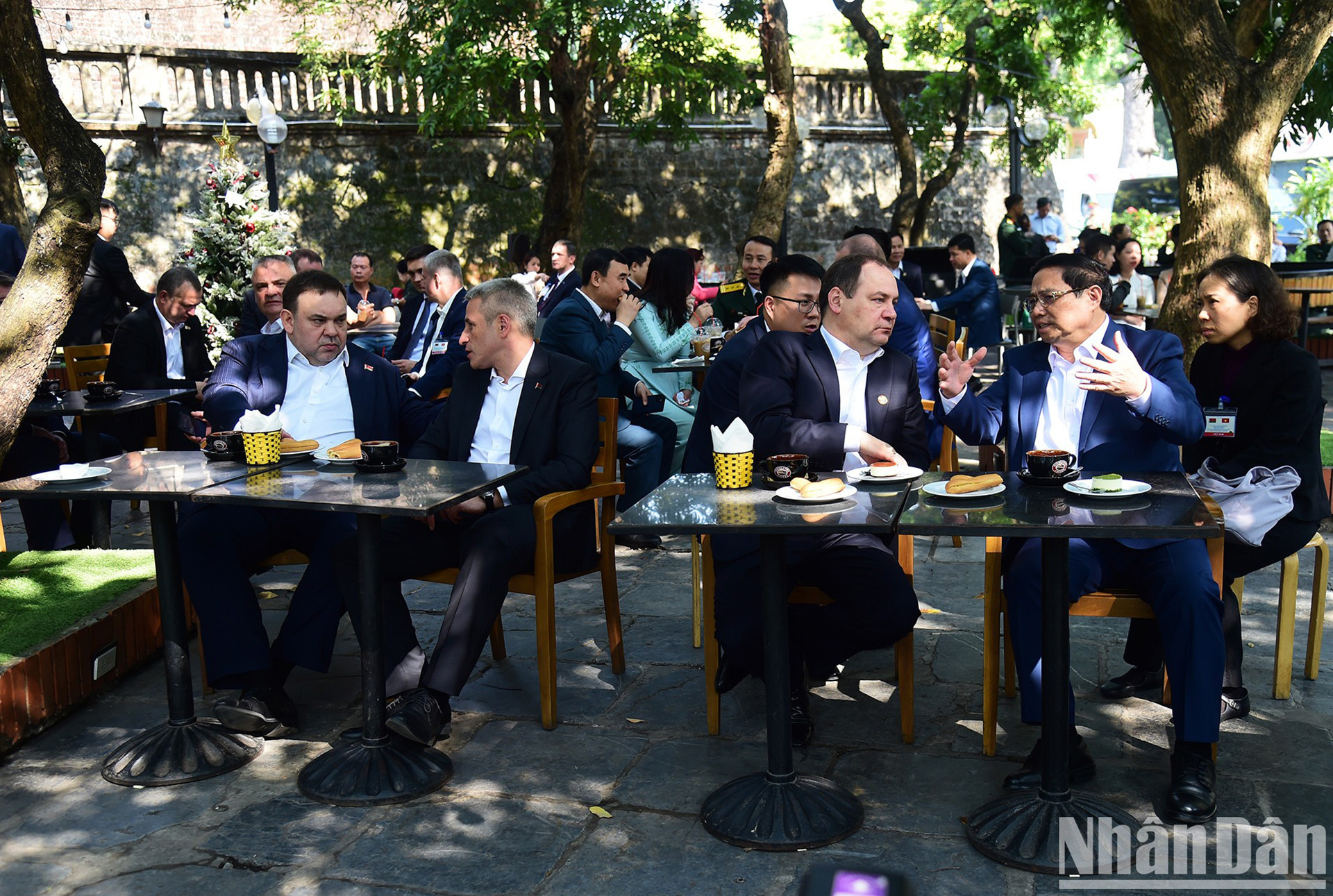 | Премьер-министр Фам Минь Тьинь и Премьер-министр Беларуси Роман Головченко наслаждаются кофе и любуются уличным пространством Ханоя. |