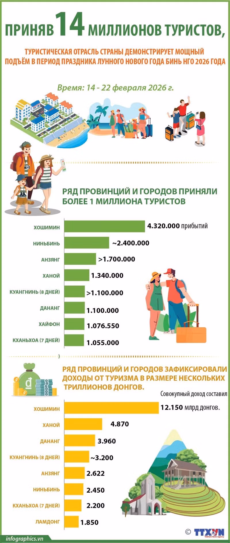 По оценкам, за 9 дней празднования Лунного Нового года Бинь Нго 2026 туристическая отрасль страны приняла и обслужила около 14 млн туристов, что на 12 % больше по сравнению с аналогичным периодом 2025 года.