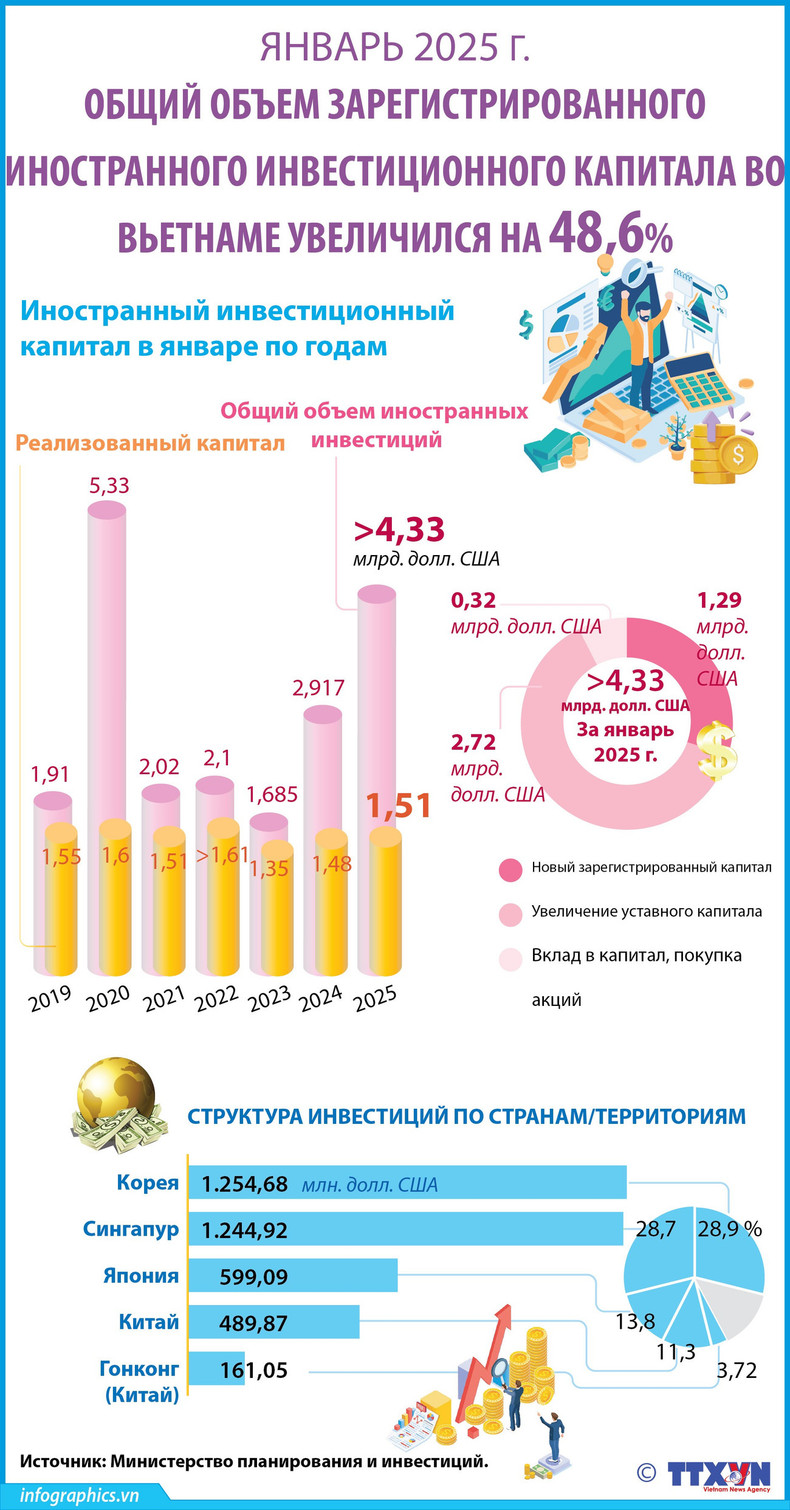 По данным Министерства планирования и инвестиций, в январе во Вьетнам поступило более 4,33 миллиарда долларов США прямых иностранных инвестиций (ПИИ), что на 48,6% больше, чем в прошлом году.