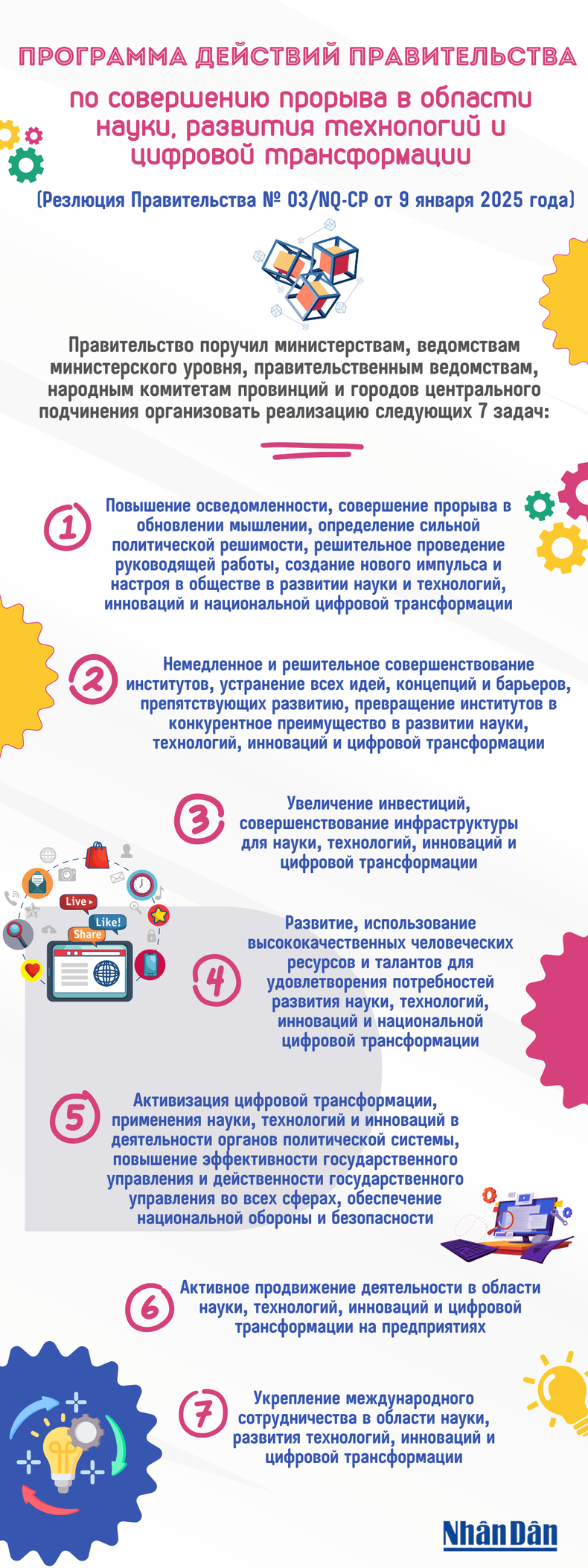 Резолюции №57-NQ/TW о совершении прорыва в развитии науки, технологий, инноваций и национальной цифровой трансформации, Правительство поручил министерствам, ведомствам министерского уровня, правительственным ведомствам, народным комитетам провинций и городов центрального подчинения организовать реализацию ряд задач.