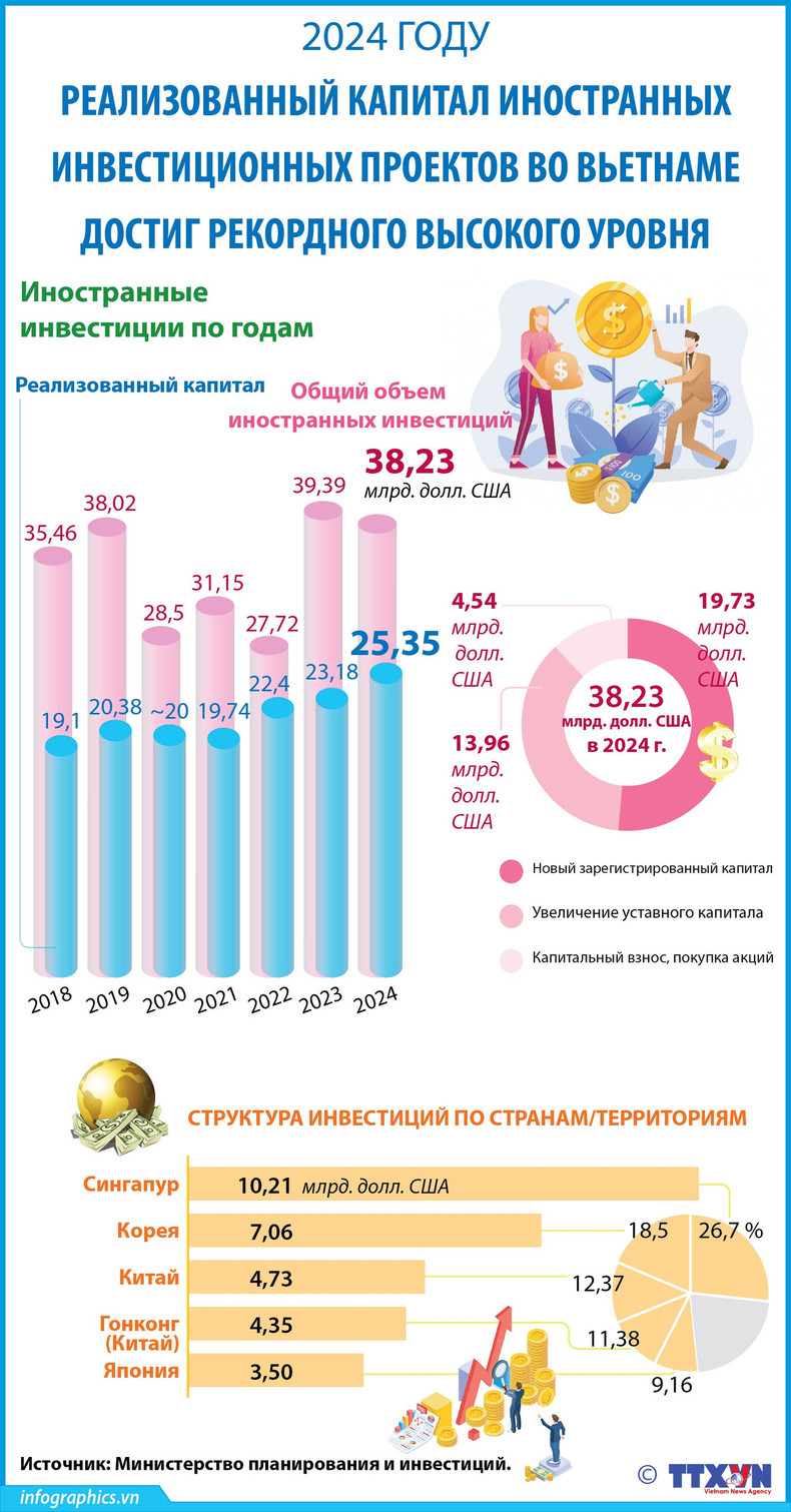 По оценкам, к концу 2024 года объем выплаченных ПИИ во Вьетнаме достиг примерно 25,35 миллиарда долларов США, увеличившись на 9,4% по сравнению с 2023 годом, что является самым высоким показателем за всю историю наблюдений. Общий объем вновь зарегистрированного капитала, корректировки дополнительного капитала, а также взносы иностранных инвесторов в капитал и покупка акций оцениваются почти в 38,23 миллиарда долларов США.