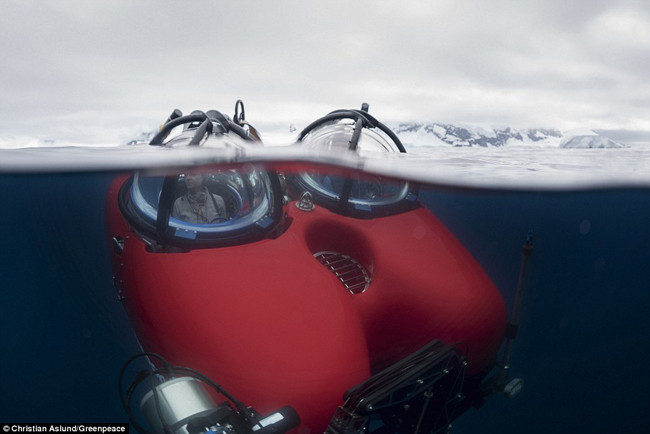 Два ученых сидят в подводной лодке, подготавливаясь к дайвингу для научных исследований на Антарктическом полуострове. Фото: Christian Aslund