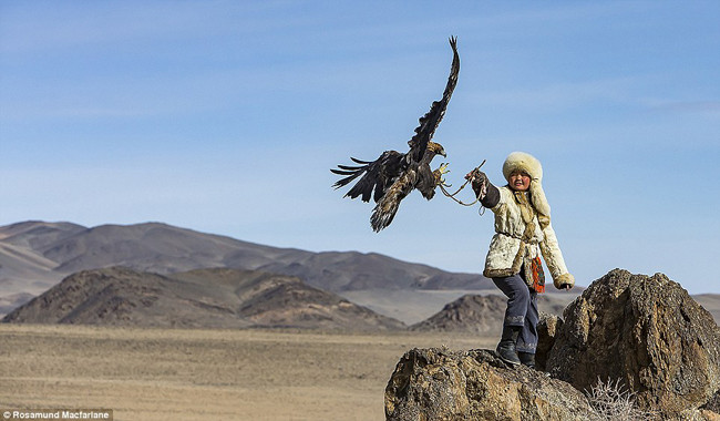 Девушка дрессирует орла в Алтайских горах, Монголия. Фото: Rosamund Macfarlane
