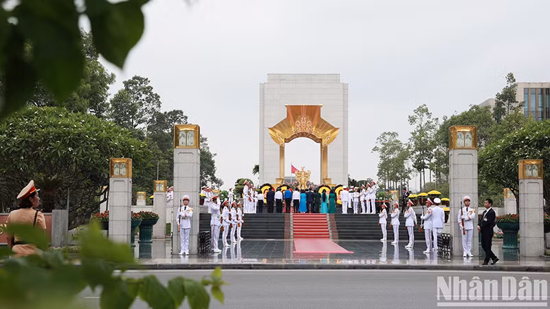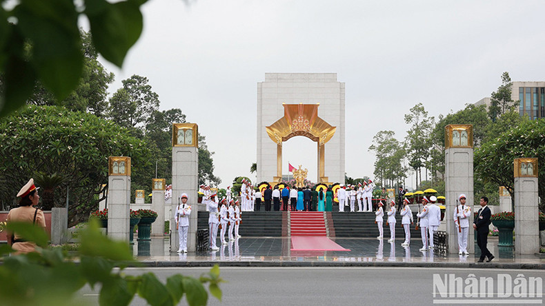 Далее бывшие и действующие руководители Партии и Государства, руководители министерств, ведомств, центральных отраслей и города Ханоя возложили венки и воскурили благовония в память о павших бойцах у Монумента павшим за Родину на улице Бакшон, Ханой.