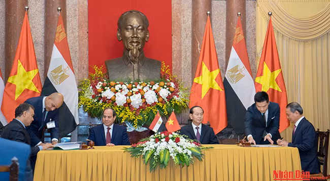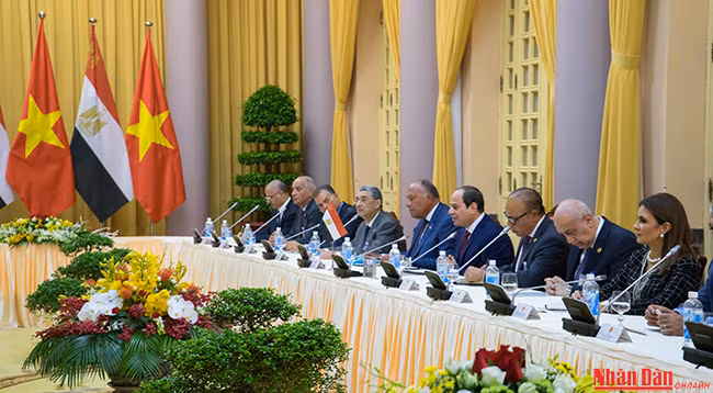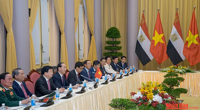 Со своей стороны, Президент Египта Абдель Фаттах ас-Сиси отметил решимость в дальнейшем содействовать развитию отношений сотрудничества с вьетнамской стороной во всех областях, в частности, в сферах экономики, торговли, инвестиций, культурного обмена и др. Глава государства Египта также выразил свое желание больше узнать об опыте развития Вьетнама, предложил двум странам активизировать обмен визитами на высоком уровне в предстоящее время.