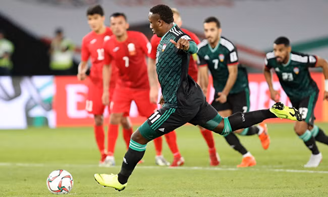 пенальти в ворота Кыргызстана, и игроку ОАЭ Ахмеду Халилу удалось реализовать полученный шанс.