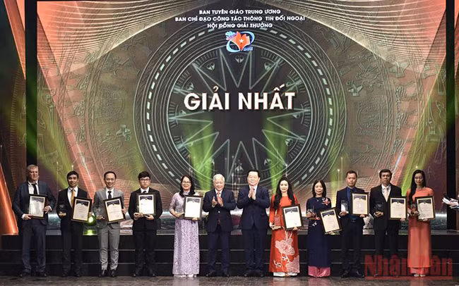 Член ЦК КПВ, Главный редактор газеты «Нянзан», Заместитель заведующего Отделом ЦК КПВ по пропаганде и политическому воспитанию, Председатель Союза журналистов Вьетнама Ле Куок Минь и Заместитель генерального директора Радио «Голос Вьетнама» Нго Минь Хиен вручают третьи призы. Фото: Чан Хай