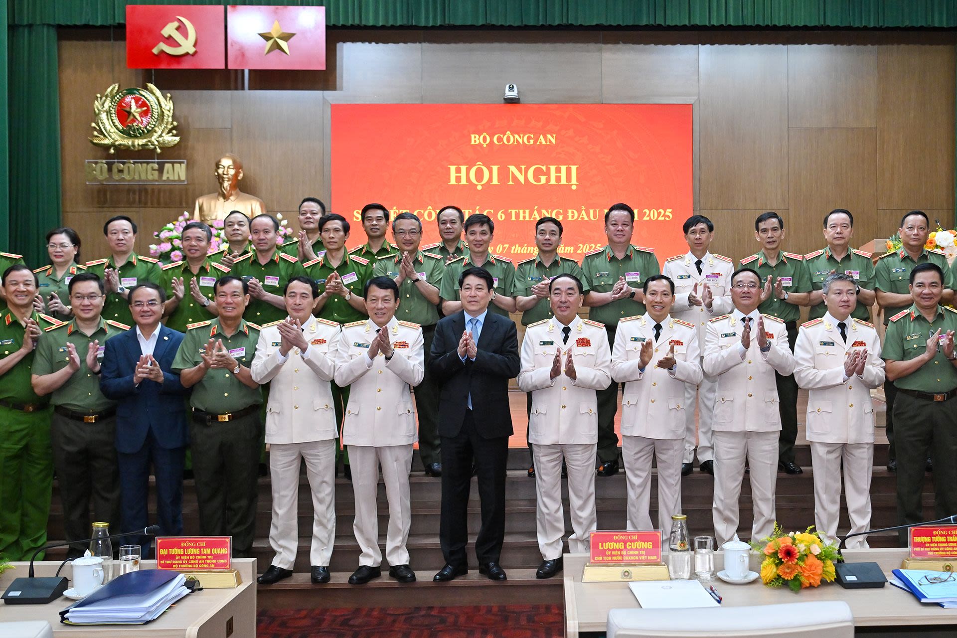 Президент Лыонг Кыонг и делегаты на обзорной конференции по первым 6 месяцам года Министерства общественной безопасности, 7 июля 2025 года.
