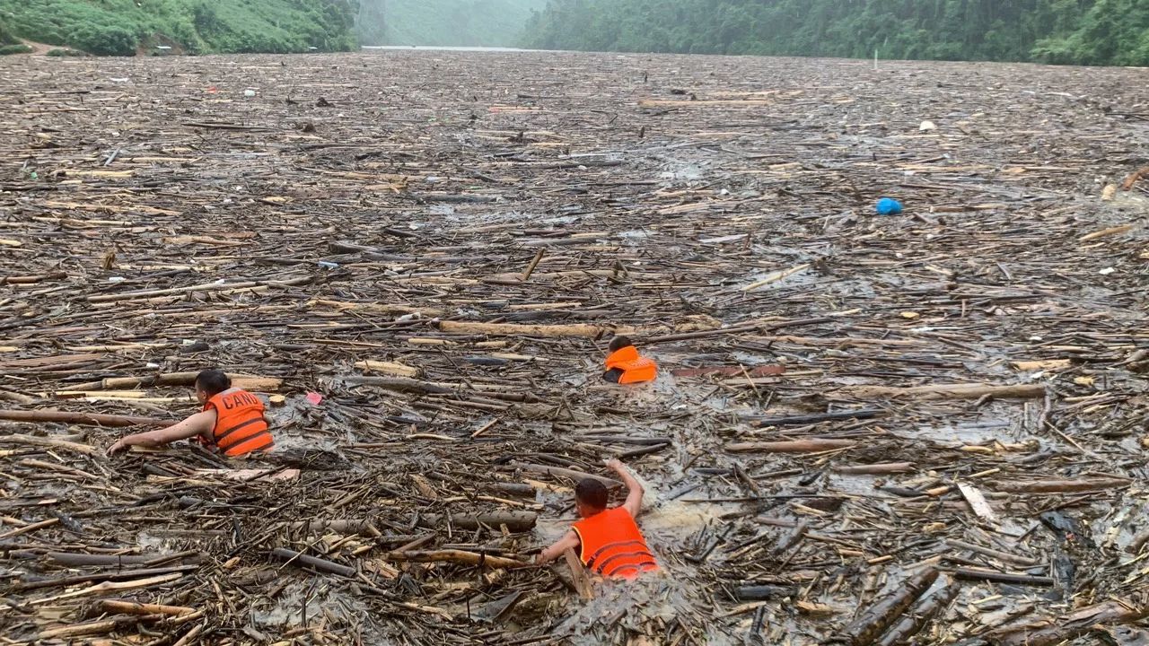 Бойцы сил общественной безопасности провинции Дьенбьен плывут по озеру Лонгтао в поисках пропавших без вести. Фото: cand.com.vn