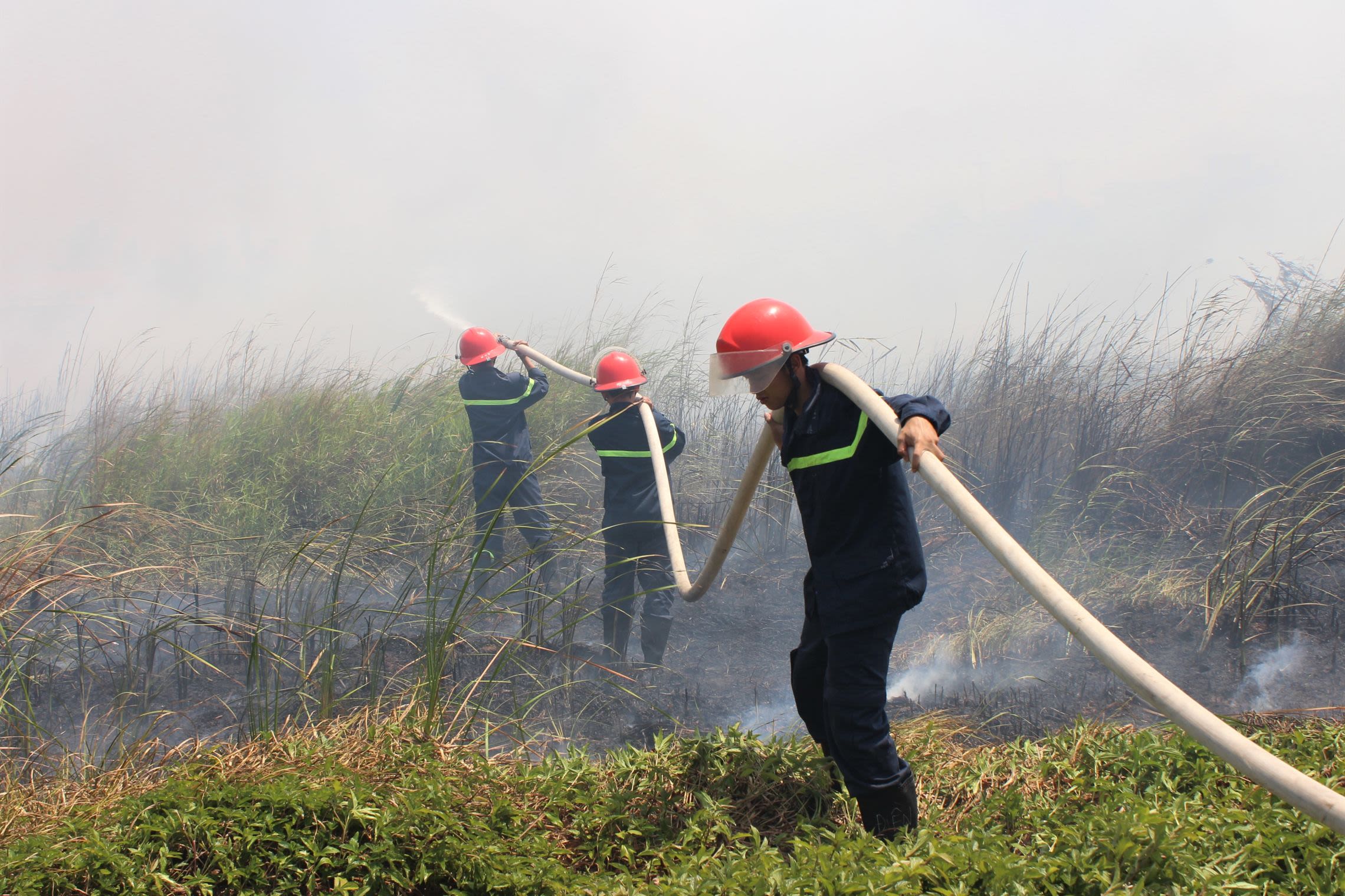 Бойцы отряда пожарной полиции, сил общественной безопасности провинции Баклиеу прилагают усилия по тушению возгорания сухой травы в жилом квартале.