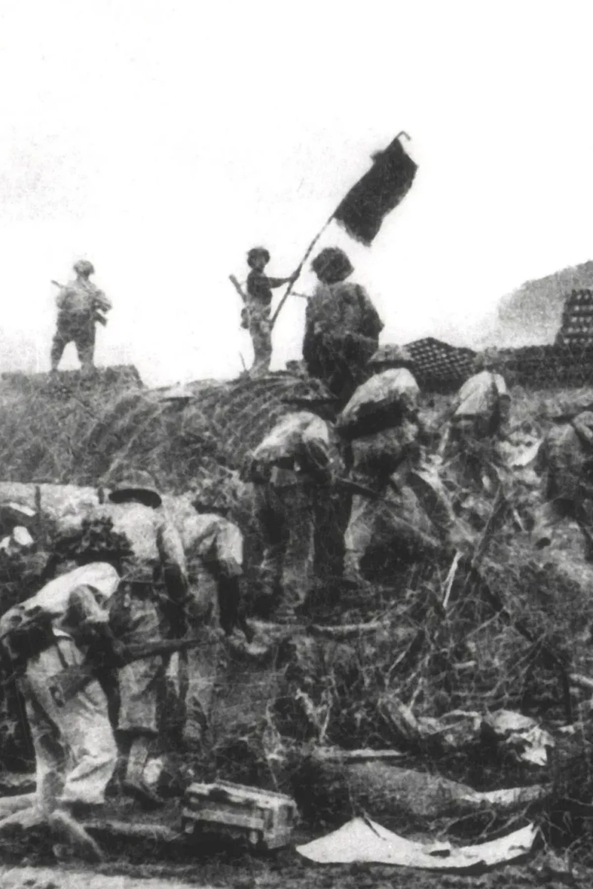 Вьетнамские солдаты размахивают флагом на крыше одного из командных бункеров французской армии в Дьенбьенфу, 7 мая 1954 года. Фото: ВИА