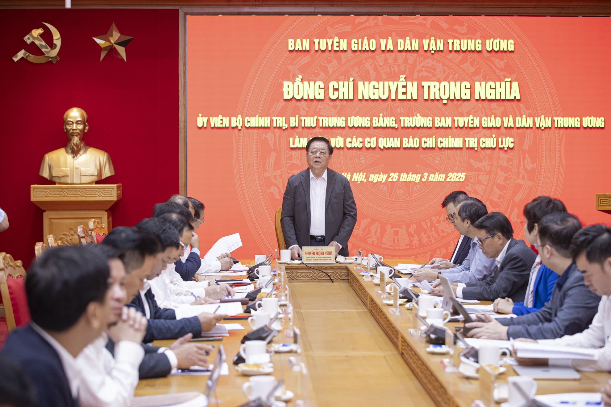Товарищ Нгуен Чонг Нгиа, член Политбюро, секретарь ЦК КПВ, заведующий Отделом ЦК КПВ по пропаганде, политическому воспитанию и работе с народными массами, провёл рабочую встречу с ведущими политическими органами печати страны.