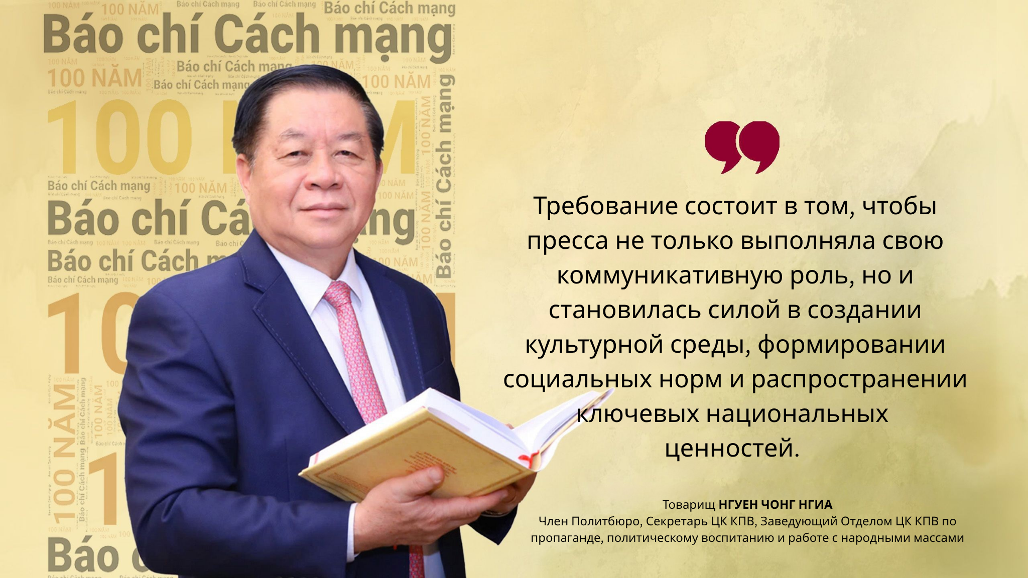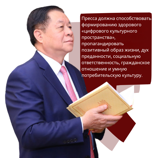 Гордимся славными традициями вьетнамской революционной прессы и глубоко осознаем важную роль прессы на новом этапе революции, внимательно следуем духу проекта документов XIV съезда КПВ о «создании профессиональной, гуманной и современной журналистики, издательской и коммуникационной деятельности». Требование состоит в том, чтобы пресса не только выполняла свою коммуникативную роль, но и становилась силой в создании культурной среды, формировании социальных норм и распространении ключевых национальных ценностей. Это система ценностей вьетнамского народа: «патриотизм, гуманность, верность, честность, солидарность, трудолюбие и креативность», сформированная и развитая СМИ, образованием и культурой.