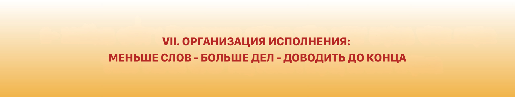 Самая большая наша слабость заключается в том, что многие руководящие принципы верны, однако их организация исполнения пока не отвечают требованиям. Поэтому в данном Документе особо подчеркивается требование к действиям; повышается ответственность каждого уровня, каждой отрасли, каждого кадра; решительно устраняется ситуация, когда «много говорят - мало делают», «красиво говорят - плохо делают», а порой и «слова расходятся с делом»; недостаток проверки и надзора; постановка высоких целей при медленном развертывании и низкой эффективности. Чтобы превратить решимость в результаты, необходимо максимально сосредоточиться на пяти группах задач: