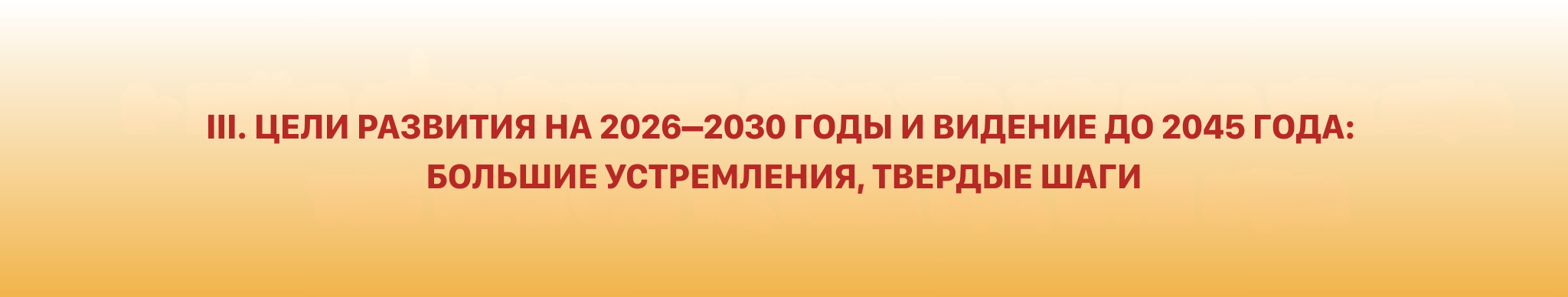 Общая цель заключается в следующем: сохранять прочную основу мирной и стабильной обстановки; обеспечивать быстрое и устойчивое развитие страны; всесторонне улучшать и повышать уровень жизни народа; укреплять стратегическую автономию, самодостаточность и уверенность в своих силах, уверенно двигаясь в новую эпоху нации; успешно реализовать цель к 2030 году стать развивающейся страной с современной промышленностью и доходом выше среднего; воплотить видение до 2045 года - стать развитой страной с высоким уровнем доходов, мирным, независимым, демократическим, богатым, процветающим, цивилизованным и счастливым социалистическим Вьетнамом. Стремиться обеспечить среднегодовые темпы роста валового внутреннего продукта (ВВП) в период 2026–2030 годов на уровне 10% и выше; довести ВВП на душу населения к 2030 году примерно до 8 500 долл. США в год.