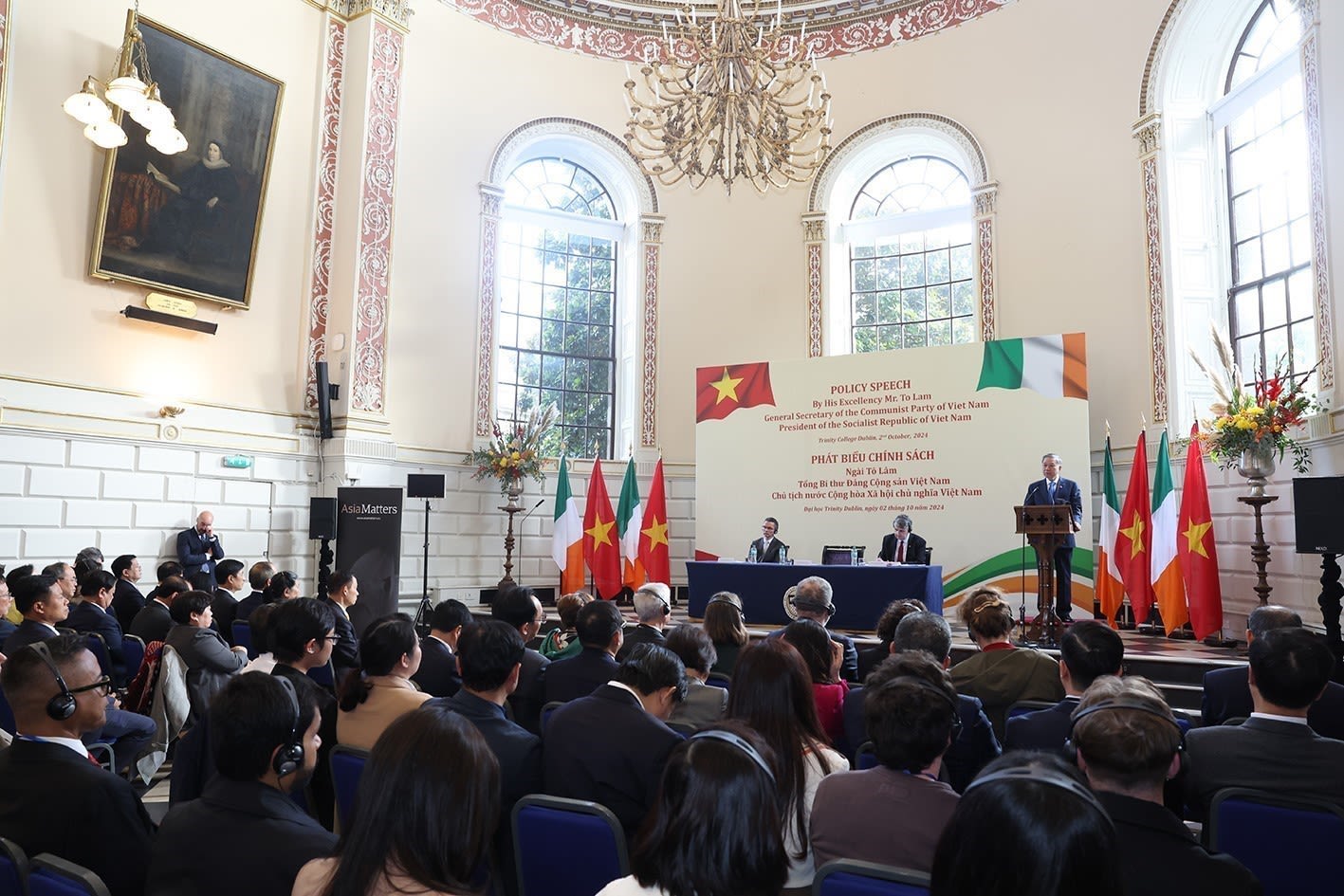 В своем выступлении в Тринити-колледже в Дублине на тему «Видение новой эры в отношениях дружбы и сотрудничества между Вьетнамом и Ирландией, ради мира, сотрудничества и развития» Генеральный секретарь ЦК КПВ, Президент То Лам подчеркнул: «Патриотизм, идеалы свободы, национальной независимости, стремление к миру и общие культурные ценности станут «клеем», связывающим два народа сегодня и завтра, и прочной базой для более интенсивного развития вьетнамско-ирландских отношений в предстоящее время».