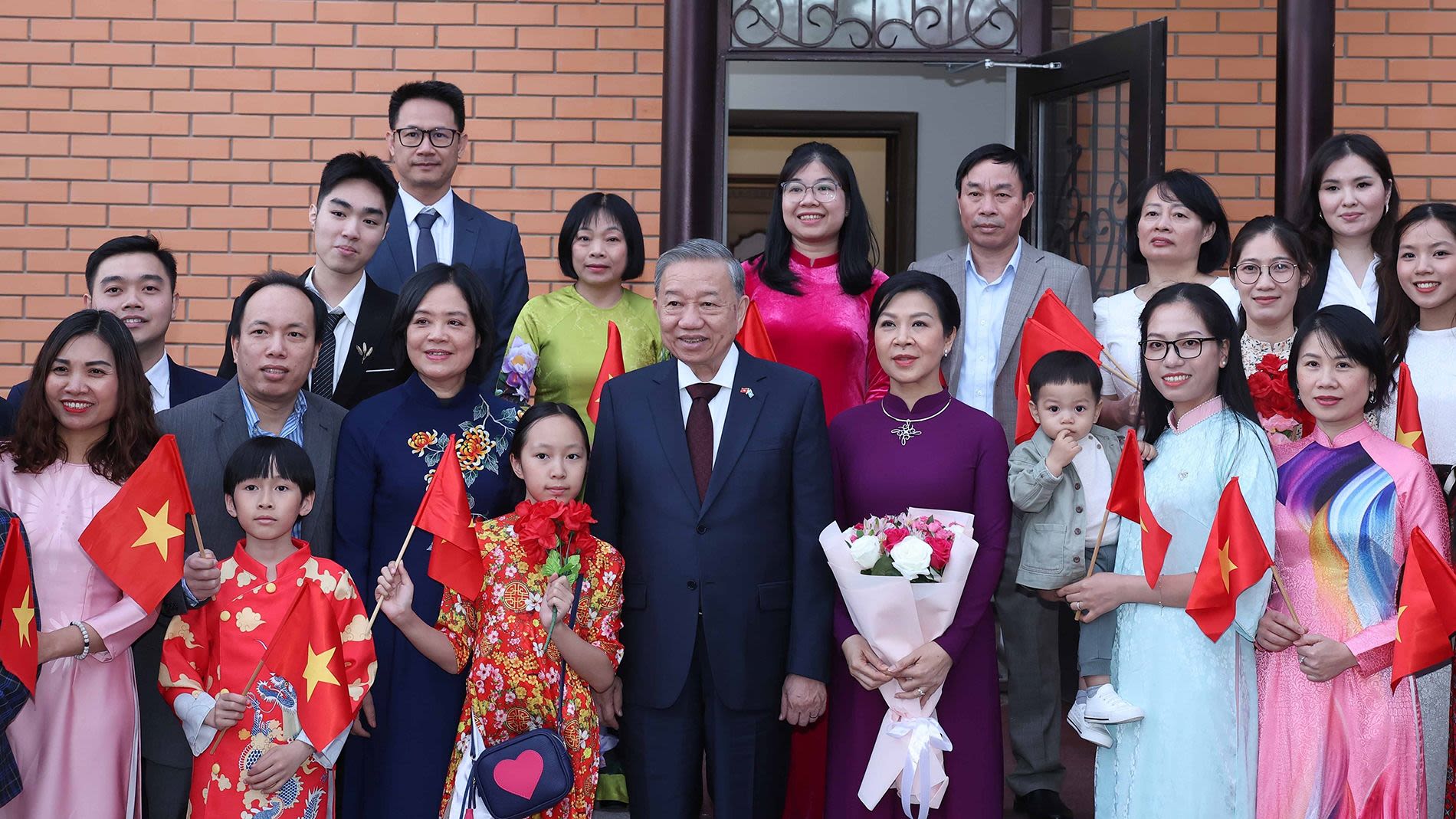 Генеральный секретарь ЦК КПВ То Лам и его супруга встретились с сотрудниками Посольства Вьетнама и представителями вьетнамской общины в Российской Федерации. Фото: ВИА