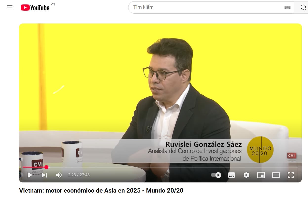 В рамках рубрики «Геополитика Mundo 20/20», которую ведет журналист Адиянес Сальес, состоялась беседа с кандидатом наук Рувислеем Гонсалесом Саэсом — председателем Исследовательской группы по делам Азиатско-Тихоокеанского региона при Центре исследований международной политики (CIPI), заместителем председателя Общества кубинско-вьетнамской дружбы. Темой разговора стала роль Вьетнама как одного из драйверов экономического роста Азии в 2025 году.