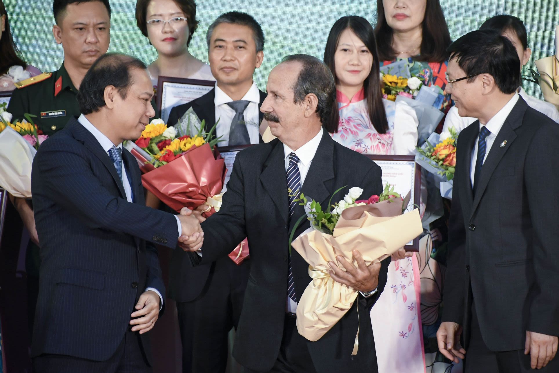 Журналист Альберто Салазар (в центре) получает поощрительный приз Национальной премии внешнего информирования Вьетнама в 2018 году за цикл статей «Bombas y minas en Vietnam, un drama que no termina» («Бомбы и мины во Вьетнаме — трагедия, которая не заканчивается»), опубликованный на испаноязычной версии VietnamPlus. Фото предоставлено персонажем