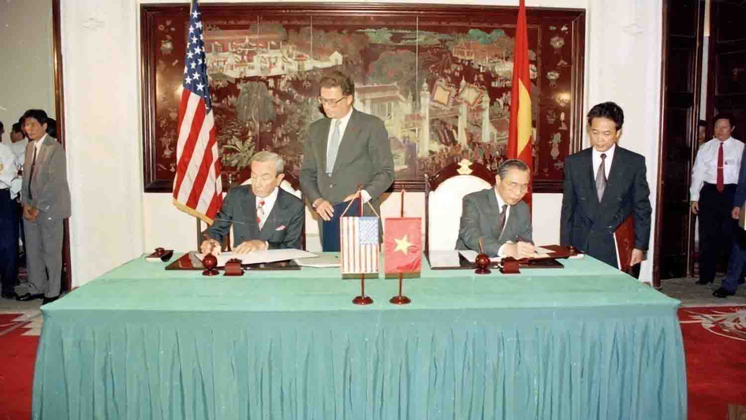 5 августа 1995 года в Ханое Госсекретарь США Уоррен Кристофер и Министр иностранных дел Вьетнама Нгуен Мань Кам подписали Протокол об официальном установлении дипломатических отношений между двумя странами. (Фото: ВИА)