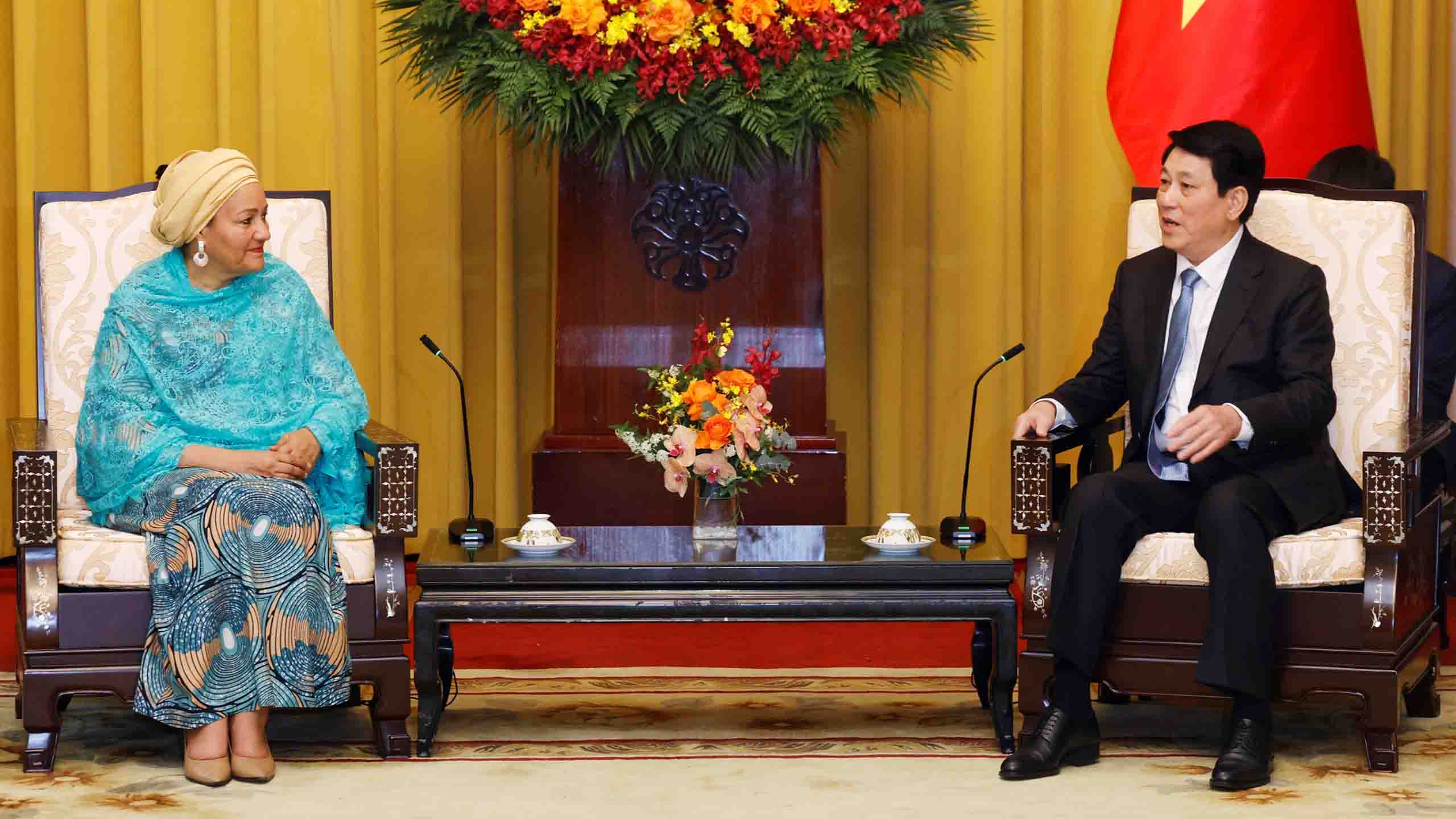 Президент Лыонг Кыонг принимает Заместителя генерального секретаря ООН Аминy Мохаммед во время участия во 4-м саммите форума «Партнерство ради зеленого роста и глобальных целей – 2030» (P4G), состоявшемся в Ханое, 17 апреля 2025 года. (Фото: ВИА)