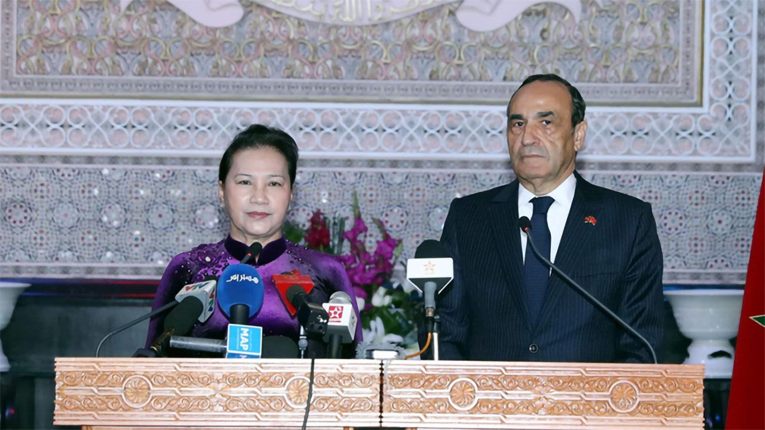 Председатель НС Нгуен Тхи Ким Нган и председатель Палаты представителей Марокко Хабиб Эль-Малики сопредседательствуют на совместной пресс-конференции после переговоров во время официального визита в Марокко, март 2019 года. Фото: ВИА