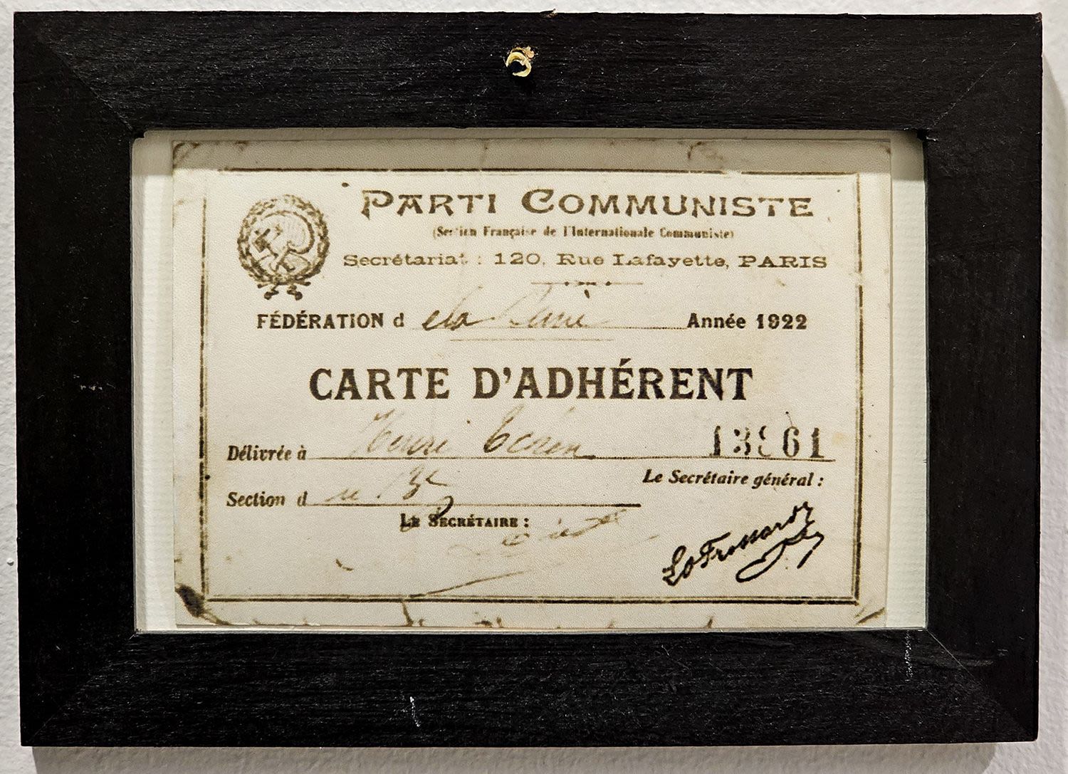 Партийный билет Французской коммунистической партии на имя Анри Чена – партийное имя Нгуен Ай Куока, 1922 год.