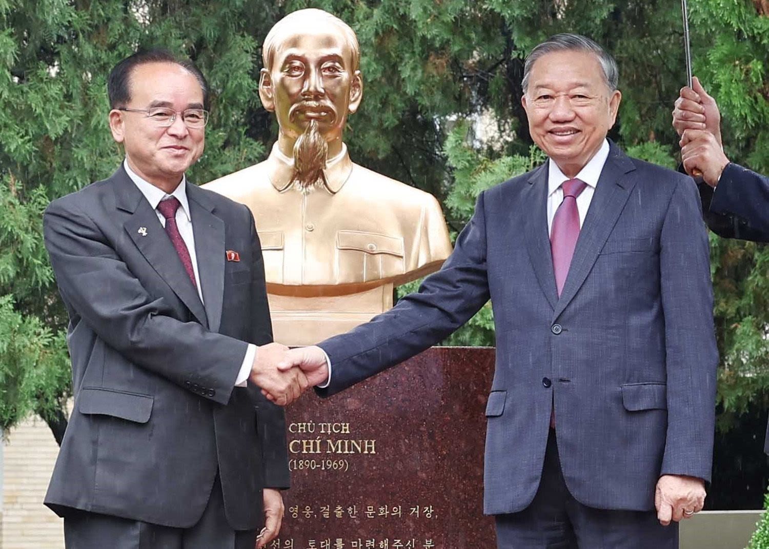 Генеральный секретарь ЦК КПВ То Лам и член Постоянного комитета Политбюро, секретарь ЦК, Заведующий Организационным отделом ЦК ТПК Чо Ён Вон на церемонии открытия памятника Президенту Хо Ши Мину в Посольстве Вьетнама в КНДР. (Фото: ВИА)