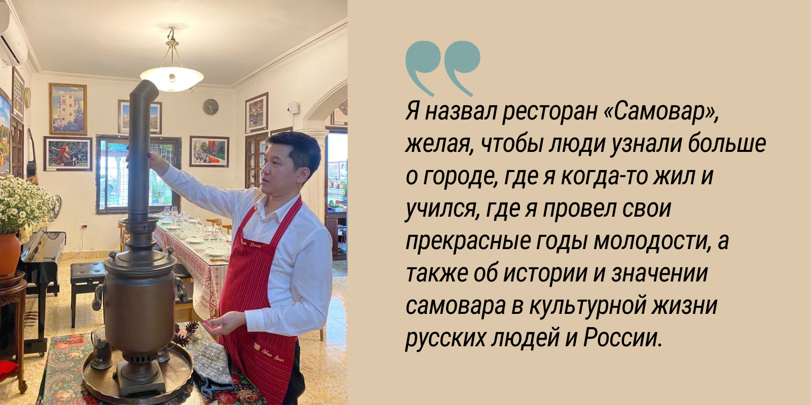 Тиен сказал: «Я назвал ресторан «Самовар», желая, чтобы люди узнали больше о городе, где я когда-то жил и учился, где я провел свои прекрасные годы молодости, а также об истории и значении самовара в культурной жизни русских людей и России».