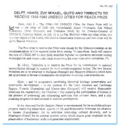 Ханой в качестве организатора Саммита МОФ в ноябре 1997 года и Саммита АСЕАН в декабре 1998 года внес значительный вклад в успех этих саммитов. Во время саммитов высокопоставленные руководители и международные друзья с разных стран мира своими глазами увидели Ханой – город зеленый, чистый, красивый и мирный, ощутили дружелюбие, теплоту и энтузиазм местных гостеприимных жителей. Ханой со своей историей и достижениями имел все условия для регистрации на премию «Город за мир» ЮНЕСКО».