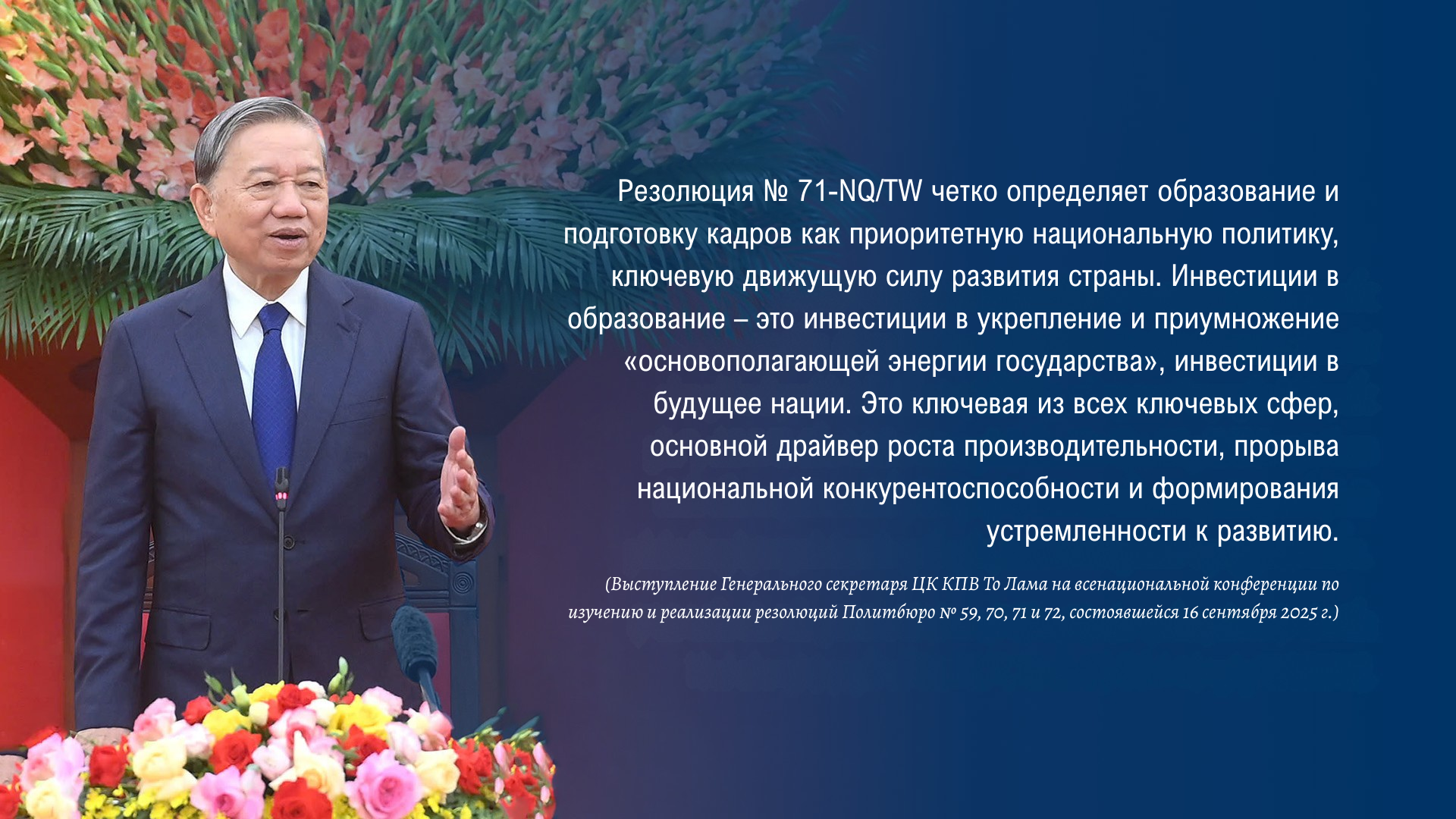 Резолюция № 71-NQ/TW подтверждает глубокое, всестороннее осознание и последовательную реализацию позиции о том, что образование и подготовка кадров являются приоритетной национальной политикой, определяющей будущее нации. Развитие образования и подготовки кадров – общее дело Партии, Государства и всего народа. Государство играет роль стратегического ориентира, создателя условий для развития, обеспечивает ресурсы и справедливость в сфере образования; гарантирует достаточное количество учебных заведений, классов и педагогов для удовлетворения потребностей населения в обучении. А все общество несет ответственность за заботу об образовании, участие в мобилизации ресурсов и общественный контроль за его развитием.