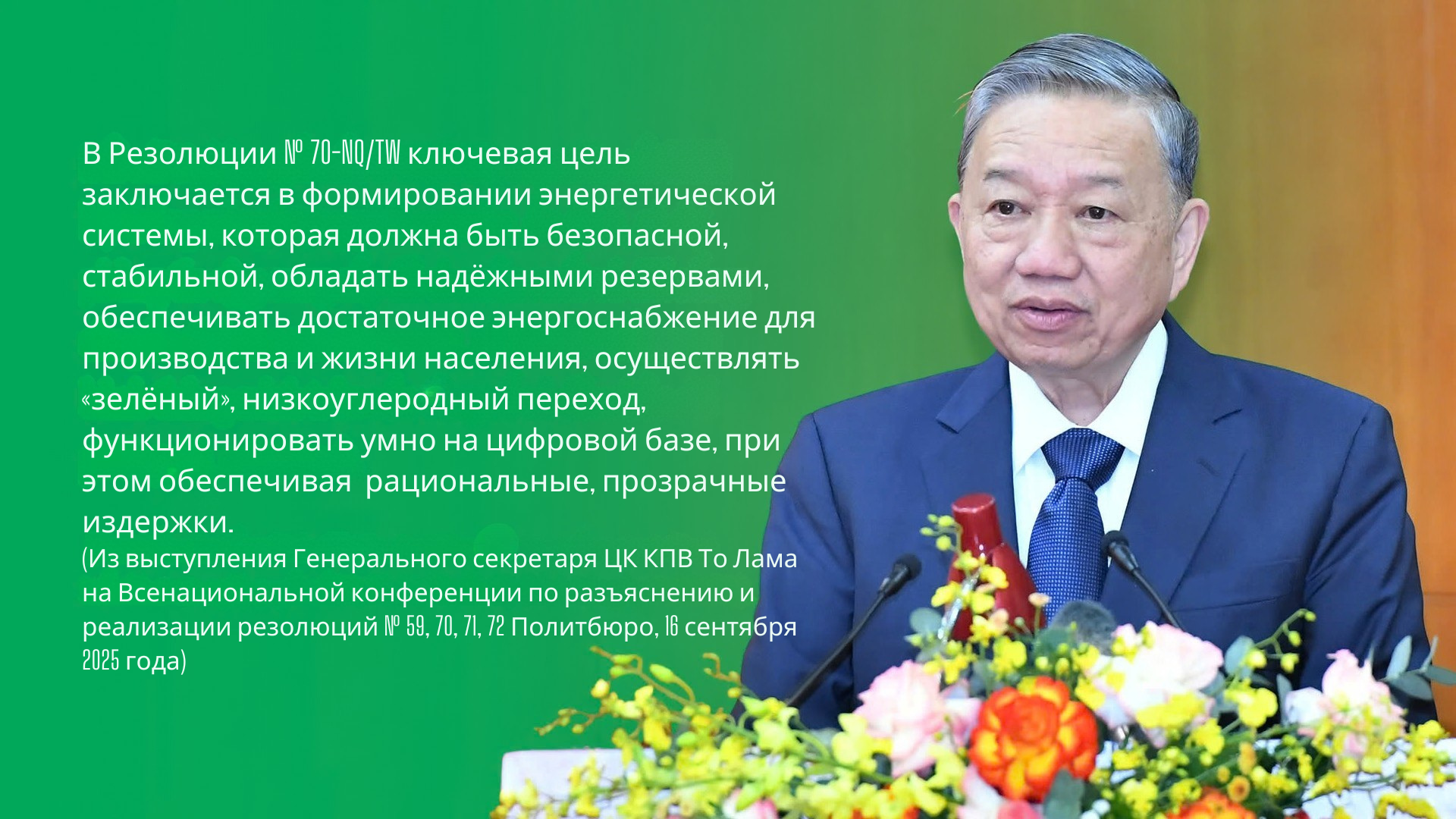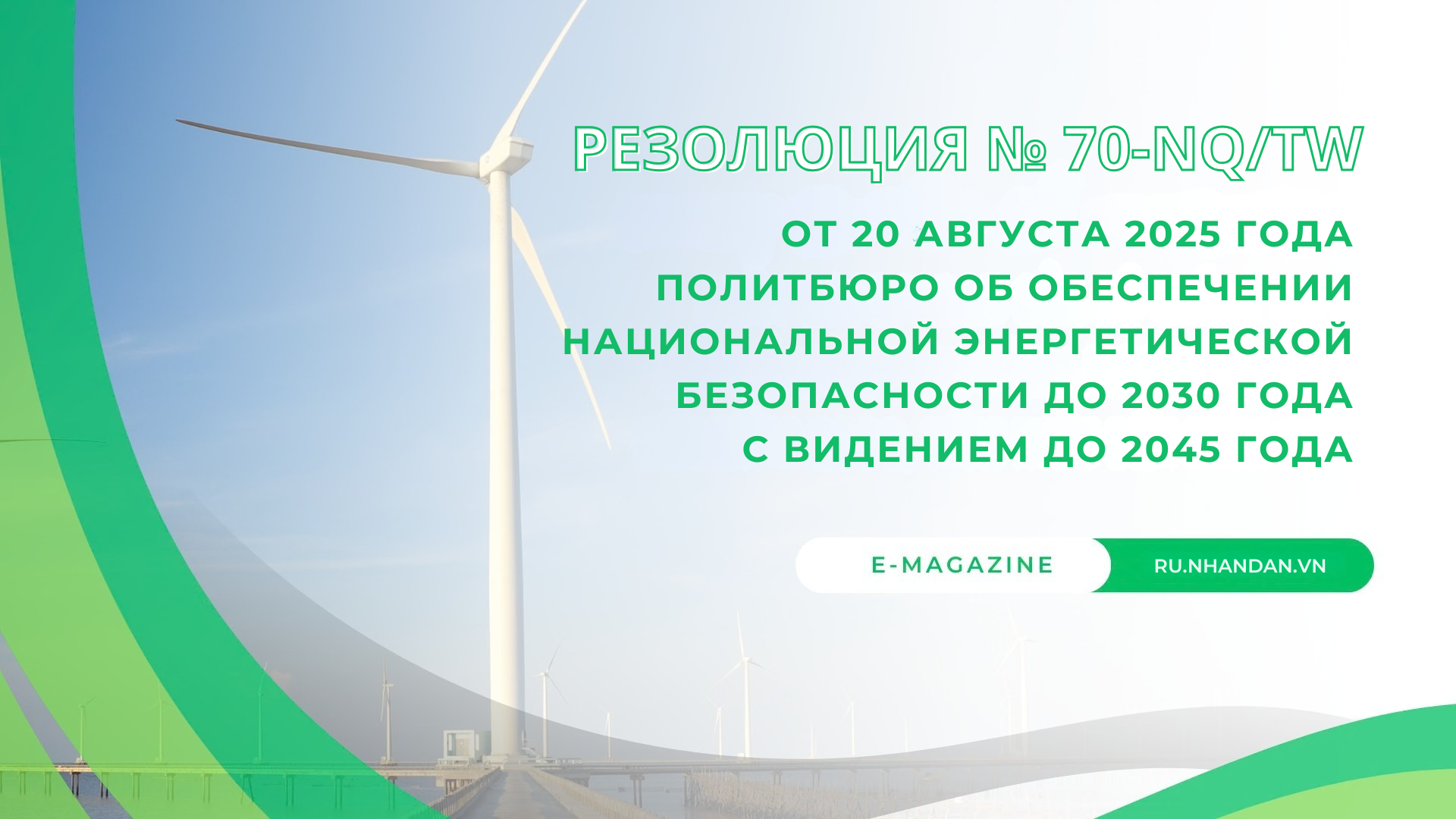 Резолюция № 70-NQ/TW подчёркивает, что энергетическая безопасность является ключевой опорой национальной безопасности в увязке с устойчивым социально-экономическим развитием, обороной и безопасностью, охраной окружающей среды и повышением уровня жизни народа. В документе чётко обозначена стратегическая цель – переход от мышления, направленного на обеспечение энергоснабжения к модели энергетической безопасности в проактивном, гибком, разнообразном и устойчивом направлении с учетом развития возобновляемых источников энергии, эффективности использования энергии и конкурентного, прозрачного энергетического рынка, тем самым удовлетворяя требованиям быстрого развития и интенсивной интеграции в новую эпоху.