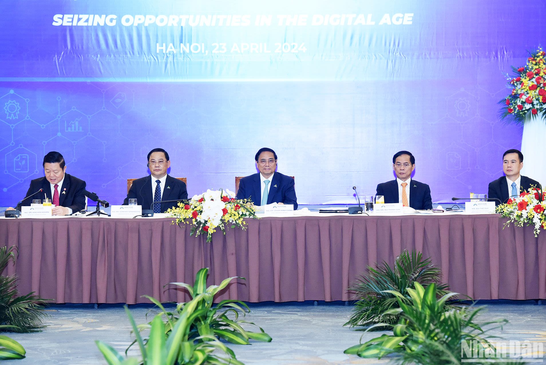 Премьер-министр Фам Минь Тьинь, Премьер-министр Лаоса Сонексай Сипхандон (второй слева) и Генеральный секретарь АСЕАН Као Ким Хорн (крайний слева) на беседе с предприятиями и партнерами АСЕАН. Фото: Чан Хай